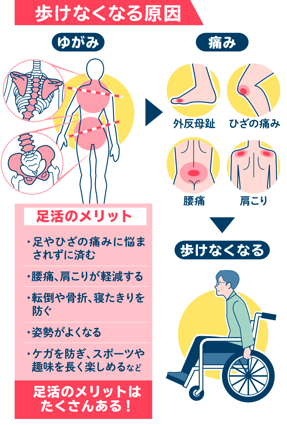 実際に、足腰の痛みなどの筋骨格系疾患は要介護の原因の約3分の1を占め、健康寿命を縮める大きな要因とされています。足のトラブルは身体をゆがめ、ゆがみは痛みを生み、痛みは骨の変形や筋肉の衰えにつながり、やがて歩けなくなることもあるのです。