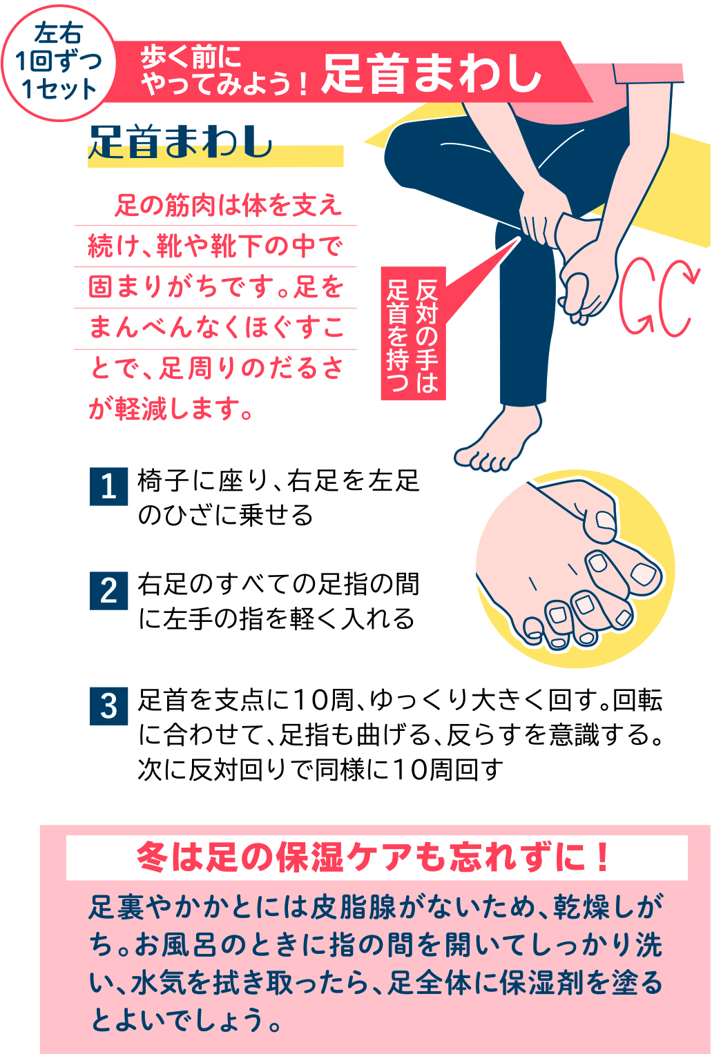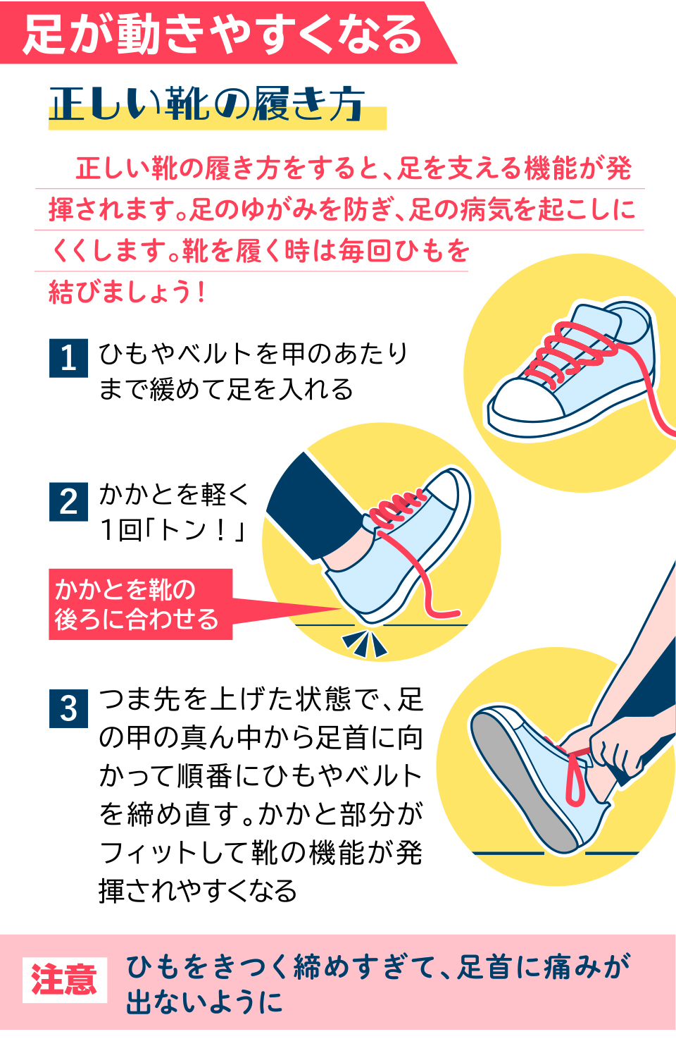足をいたわりながら少しずつ歩数を増やし、ストレッチや正しい靴選びを取り入れることで、100歳まで歩ける足を育てていきましょう。